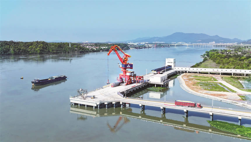 吉安港青原天玉码头,工作人员操作起重设备有序往货船上装运货物。 郭弘毅摄